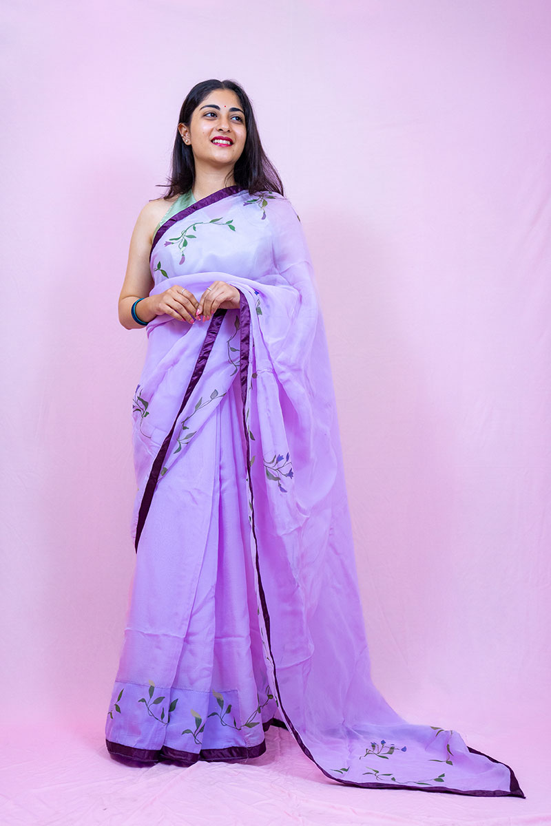 Step into a realm of timeless elegance with “Diary of a Princess”, a luxurious saree crafted from ethereal lavender silk organza. This exquisite drape is a poetic expression of grace and femininity, evoking the delicate charm of royal heirlooms and garden whispers.