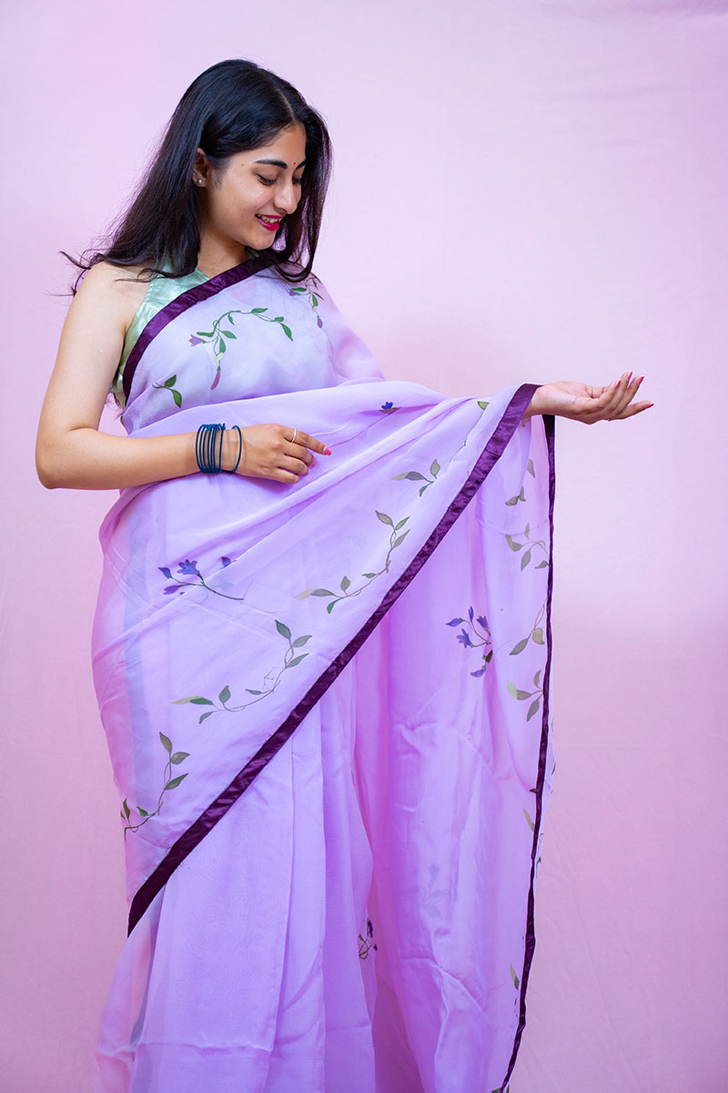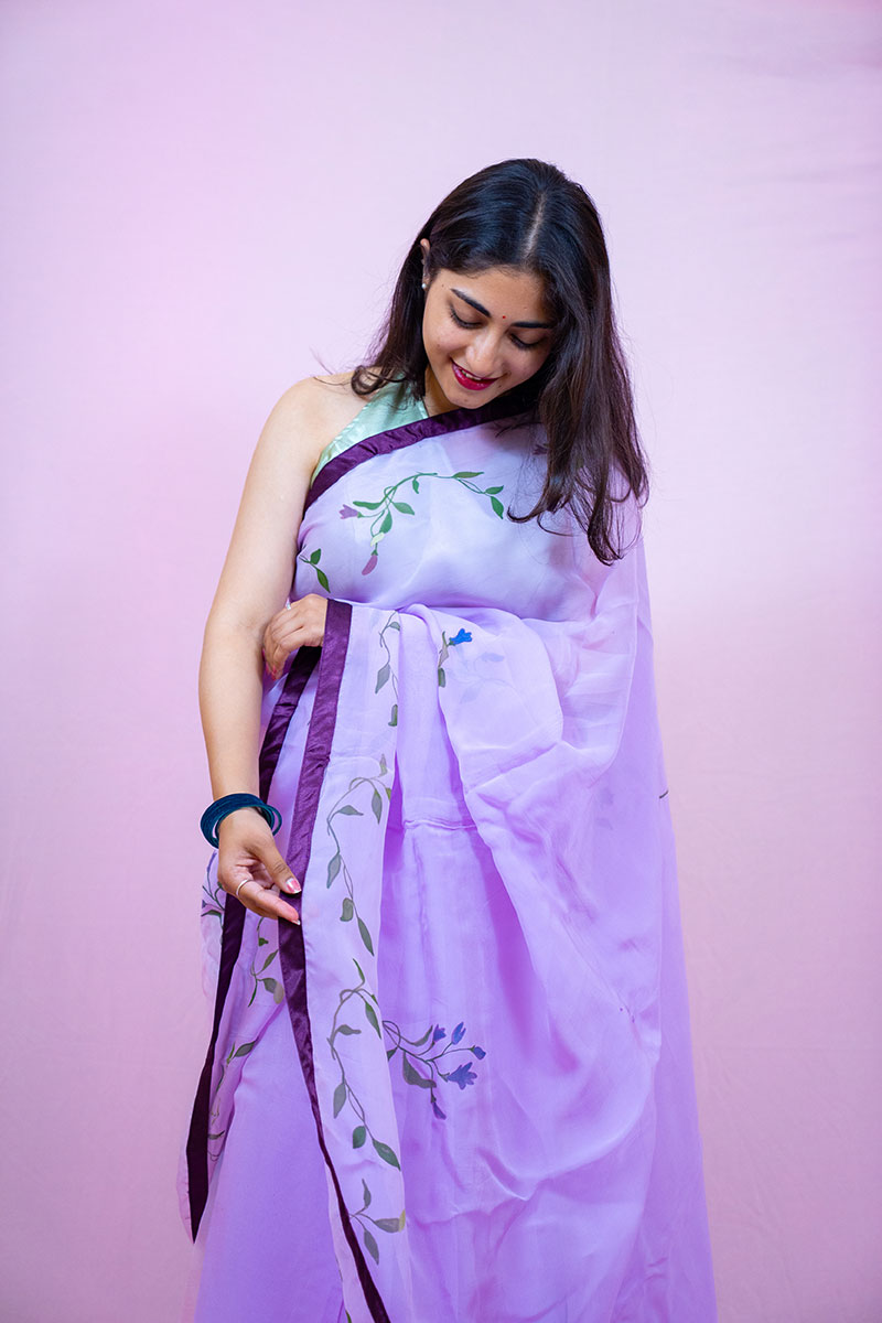 The soft lavender hue, like the first blush of twilight, forms a dreamy canvas for a hand-painted bouquet of classic English flowers. Each petal is a brushstroke of artistry, meticulously detailed with hues of blush rose, buttercup yellow, periwinkle, and sage green. The florals bloom in romantic clusters, cascading gently across the saree, reminiscent of pages from a princess’s personal journal — intimate, whimsical, and full of secret daydreams.