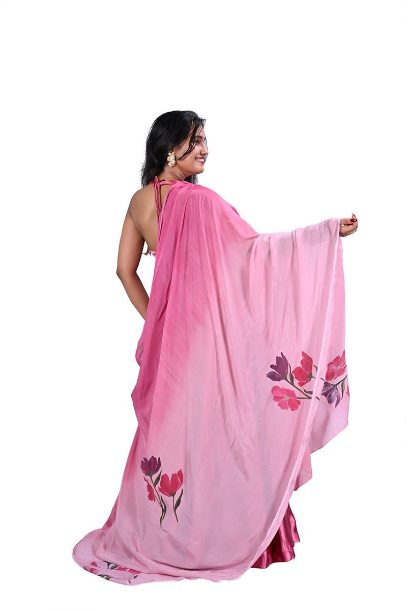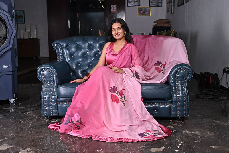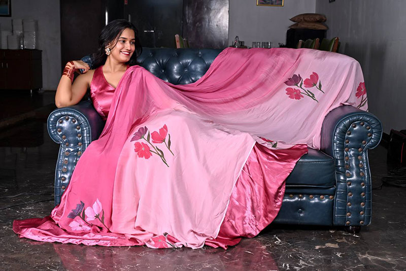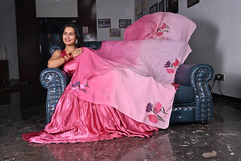 The ensemble is paired with a hand-painted ombré dupatta, where delicate shades melt from blush to bloom, kissed with botanical bouquets that seem freshly gathered from a painter’s field. Each bouquet tells its own story—petals unfolding in watercolor softness, leaves dancing with quiet elegance, and blossoms blooming with whispered affection.