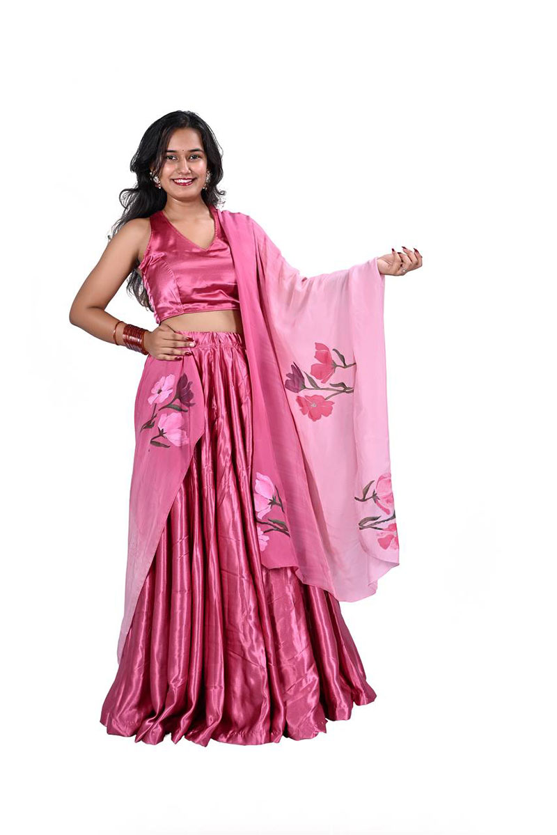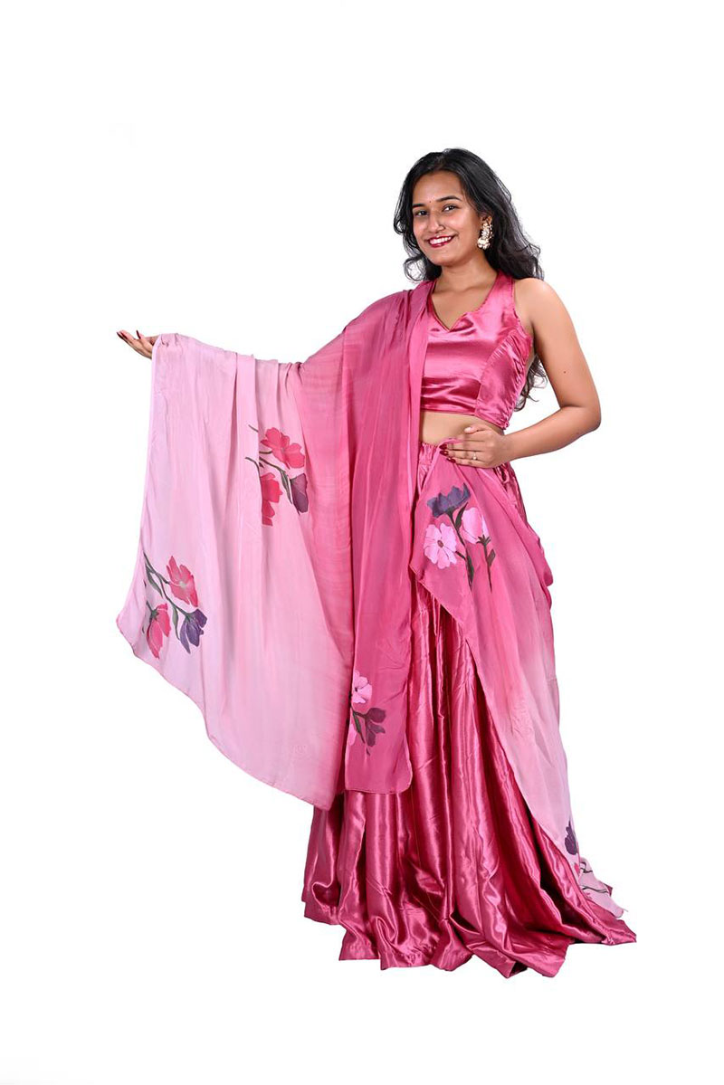 Romantic and wistful, I Wish You Roses is a 10-meter gher lehenga crafted in a dreamy old rose pink organza satin—a hue that carries the softness of faded love letters and sunset-tinted memories. With a rich flare that sways like a blooming garden in slow motion, the lehenga exudes an air of timeless grace.