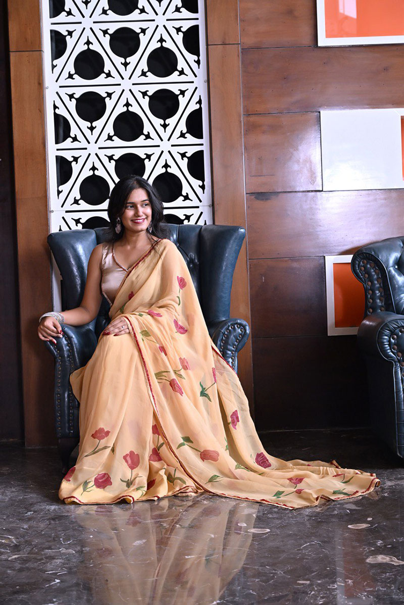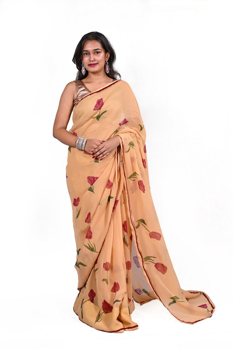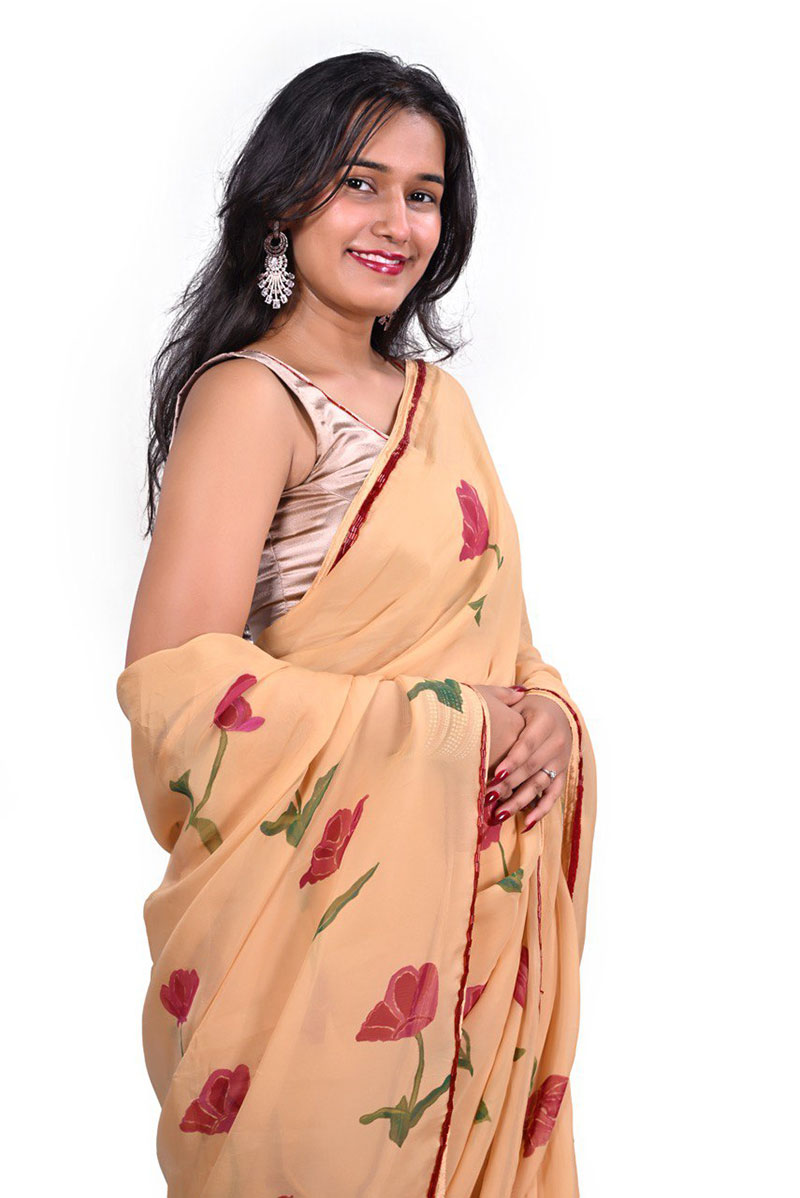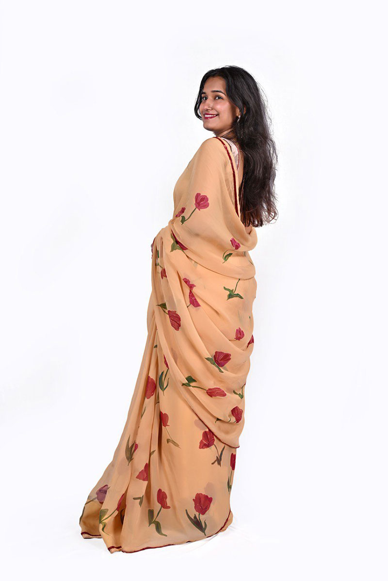 Each inch of the saree is hand-painted with deep red flowers — bold yet delicate, evoking the timeless beauty of blooming passion. The florals dance across the fabric like brushstrokes on a canvas, each petal whispering a story of devotion.