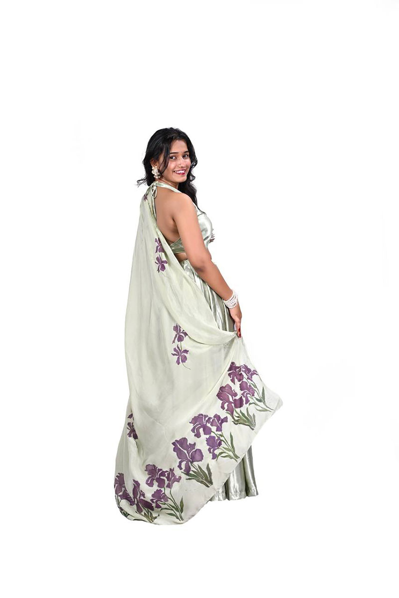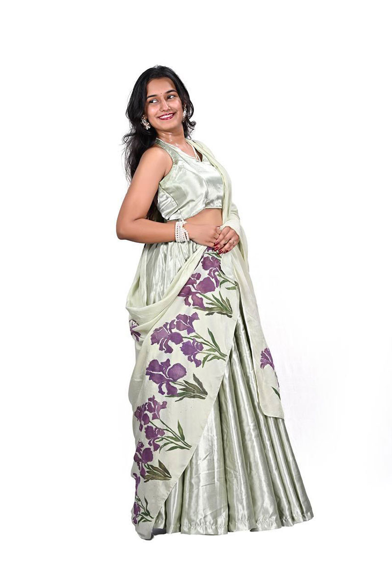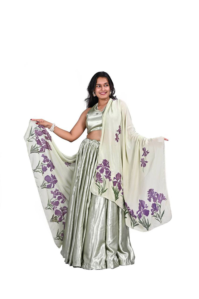The accompanying dupatta is a hand-painted canvas of delicate purple irises—each petal unfolding with painterly grace, as though kissed by forest air and filtered sunlight. The florals meander like whispers through the woods, their violet hues rich and wistful against the pale green ground.